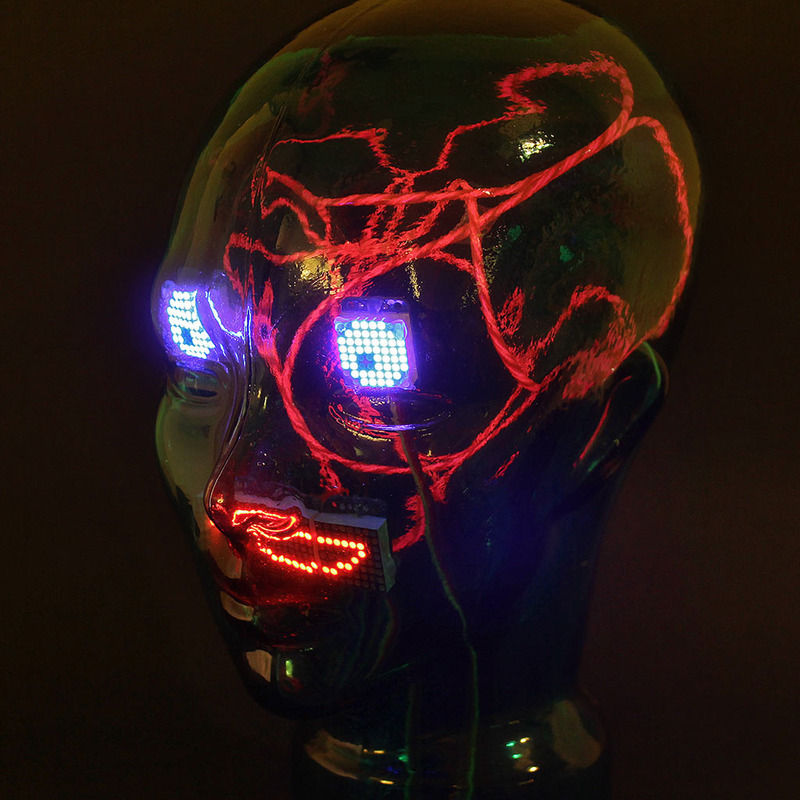 Craft stores have these wonderful realistic styrofoam skulls around Halloween time. Here we’re using LED matrices for just the eyes, no mouth (the “roboface” sketch will work all the same). We simply carved out the eye sockets to the back and pushed the LED matrices through. The eyes peer around and blink.