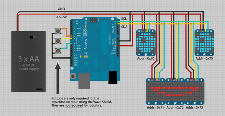 The buttons are optional — one of the example sketches (“wavface”) works together with a Wave Shield, and these are used to trigger sounds. A simpler example (“roboface”) does not require the Wave Shield or the buttons.