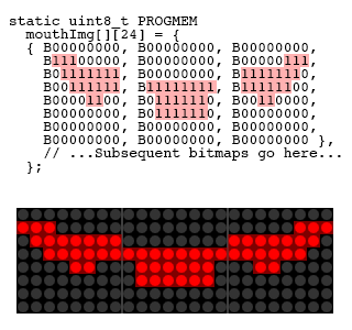 static uint8_t PROGMEM mouthImg[][24] = { { B00000000, B00000000, B00000000, B11100000, B00000000, B00000111, B01111111, B00000000, B11111110, B00111111, B11111111, B11111100, B00001100, B01111110, B00110000, B00000000, B01111110, B00000000, B00000000, B00000000, B00000000, B00000000, B00000000, B00000000 }, // ...Subsequent bitmaps go here... };
