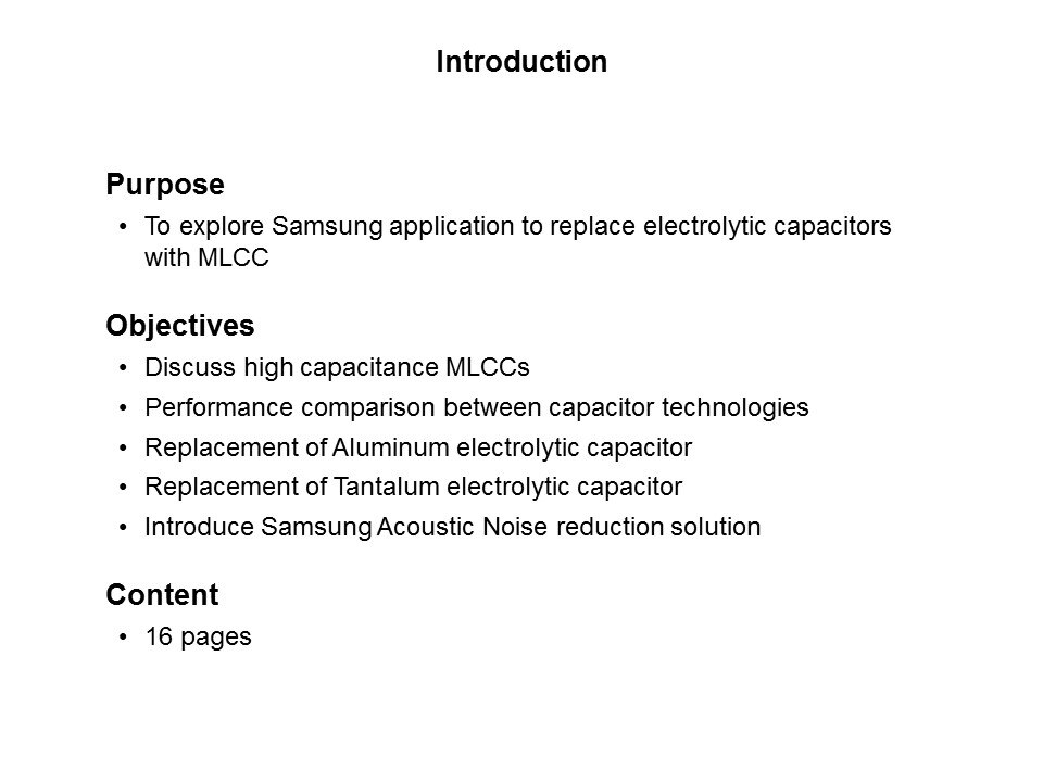 Welcome to the Samsung High Cap MLCC Family product training module. This presentation will introduce the Samsung high cap MLCC family as a solution for high cap replacement. It will discuss MLCC performance aspects and compare to the performance of electrolytic capacitors. This PTM will also offer some suggestions as a starting point to determine the MLCC values for electrolytic replacement.