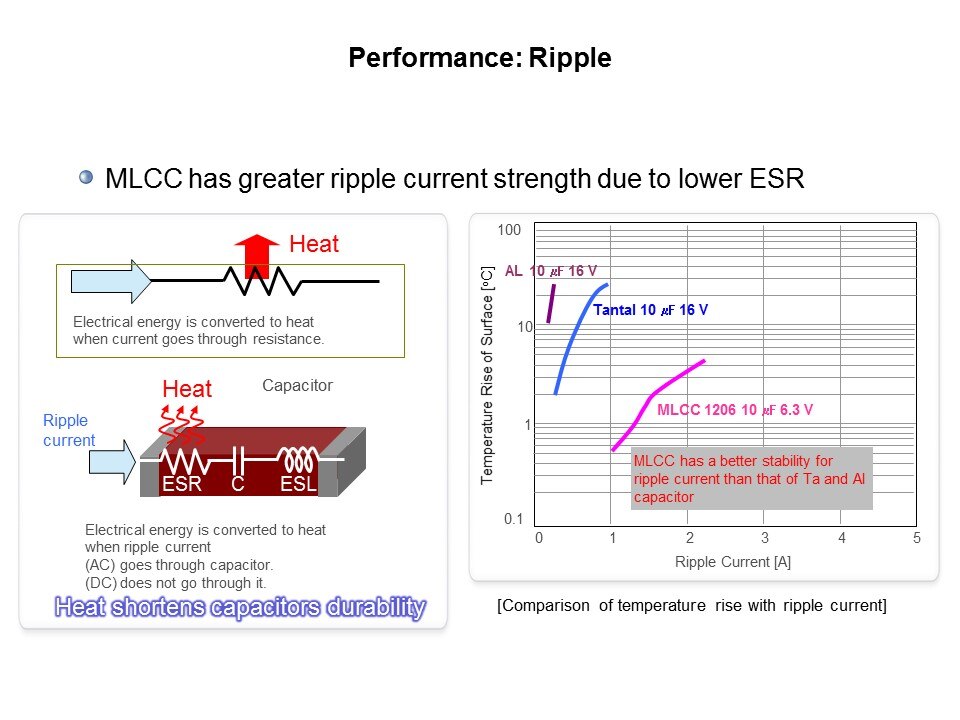 Ripple is not specified for MLCCs however characterization testing shows that MLCCs do offer higher ripple strength than electrolytic. This is due to the significantly lower ESR of the MLCCs.