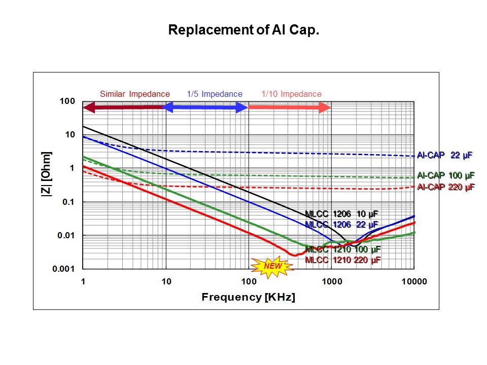 Impedance of MLCC is much lower than the Al cap. The lower impedance allows replacing the Al with a much lower MLCC cap value while giving the same circuit performance. Depending on circuit function and frequency, MLCC can be 10-100% of the original capacitance value. DC bias of the MLCC should also be considered.