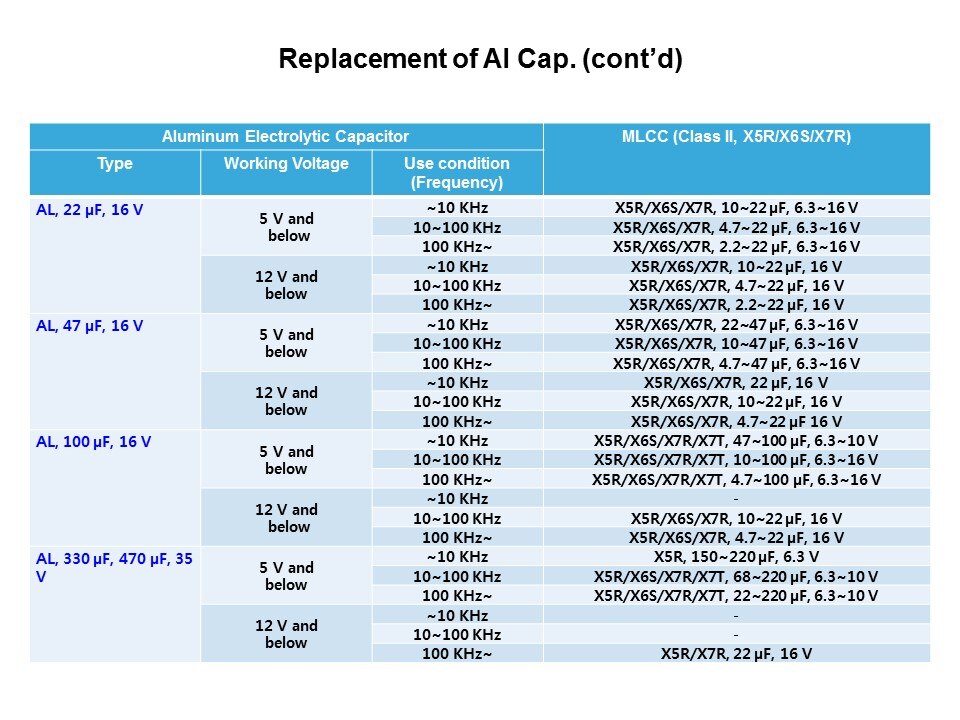 This table offers a general suggestion of replacement MLCC value. This is a starting point to decide the final MLCC value.