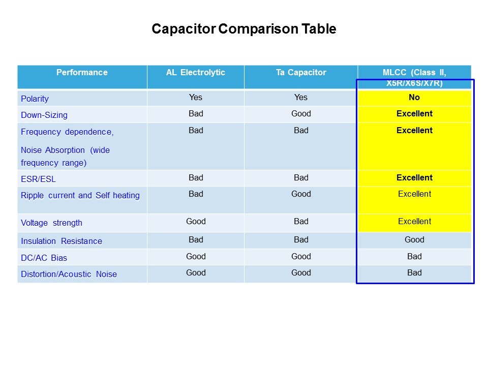 All components have strengths and weaknesses. This table shown here introduces some common performance concerns for design engineers. Which will help determine the best capacitor technology and component value for the design.