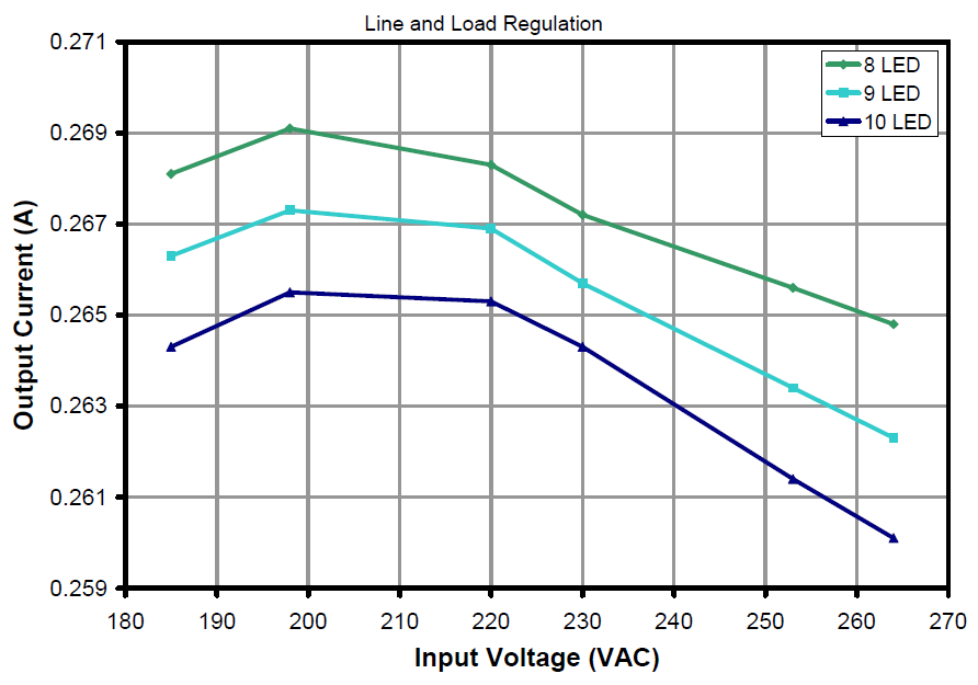 The topology used is an isolated flyback operating in continuous conduction mode. Output current regulation is sensed entirely from the primary side eliminating the need for secondary side feedback components. No external current sensing is required on the primary side either as this is performed inside the IC further reducing components and losses. The internal controller adjusts the MOSFET duty cycle to maintain a sinusoidal input current and therefore high power factor and low harmonic currents.
