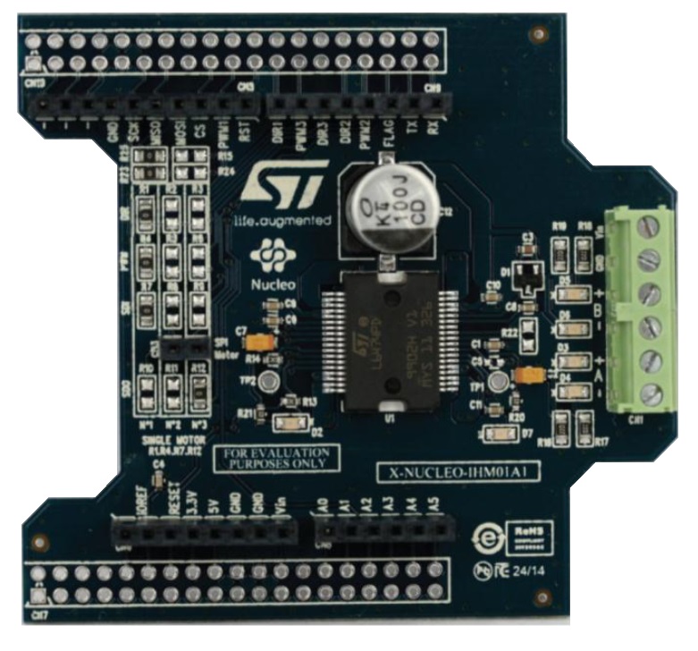 The X-NUCLEO-IHM01A1 is a stepper motor driving board based on the L6474. It provides an affordable and easy-to-use solution for driving stepper motors in your STM32 Nucleo project.